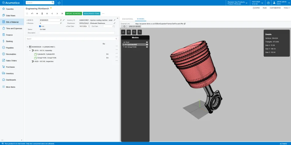 - Import 3D models directly into Acumatica Engineering Workbench